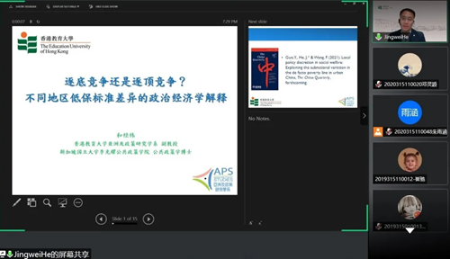 随后他阐述了最低生活保障制度的相关内容,由此延伸到本文的研究假设:第一财政能力效应;财政依赖效应;人口效应;省政府效应;邻里效应。紧接着和经纬教授介绍了研究方法及研究结论,本次研究的数据全部来自各有关官方统计年鉴,其中关键因变量为各省当年平均低保标准,最后和教授发表心得:做好文献回顾,宏观把握理论进展及关键叙事;学会重组理论叙事,服务于现实研究场景;用好 “老套”的统计年鉴。