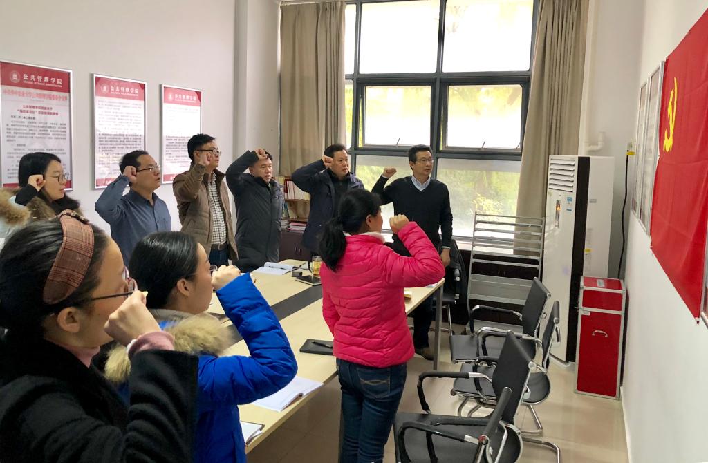 面向鲜艳的党旗,全体与会党员右手握拳庄严宣誓,重温入党誓词。然后全体党员现场收缴党费,接着支部组织委员现场领学了新党章中关于党员权利和党员义务的规定。