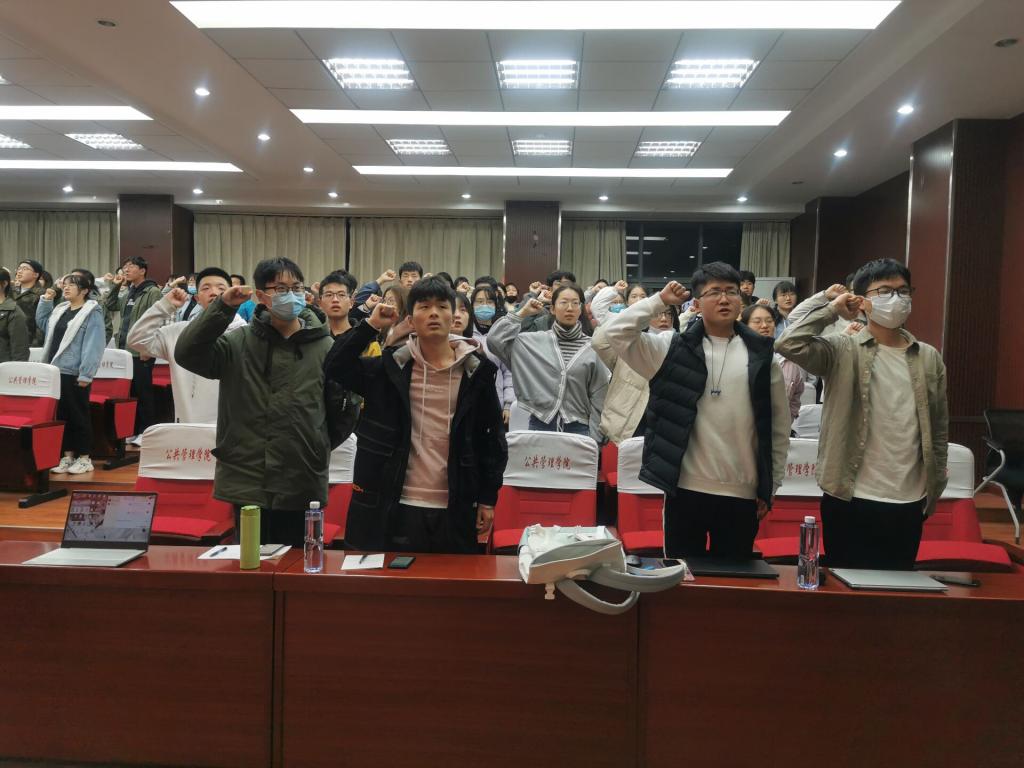 活动第二环节,团委副书记胡文伯进行了学习分享。胡文伯强调:大家一定要读党史、新中国史、改革开放史、社会主义发展史,四史作为中国共产党为人民谋幸福、为民族谋复兴、为世界谋大同的实践史,记录了党百年来的光辉历程,不可不读。此外更要切实增强在实践中守初心、担使命的思想自觉和行动自觉。胡文伯还依托国家的十四五规划细则强调了规划的重要性,并鼓励成员学以致用。分享结束后胡文伯带领全体理研会成员进行入会宣誓。