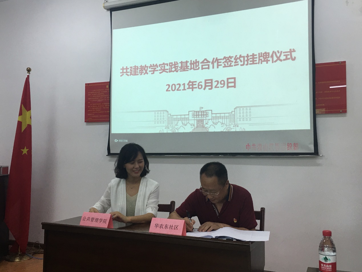 2021年6月29日,我院与狮子山街道华农东社区在东社区二楼会议室举行“共建教学实践基地”合作签约仪式。副院长丁艳华、行政管理专业党支部书记王家合、行政管理系主任姜庆志、行政管理专业教师代表李元珍、黄宸和宋钰,以及狮子山街道人大工委主任甘顺利、华农东社区党支部书记陈华伟、居委会主任王根平、专职副书记刘雅梦、社区副主任王寅出席了签约仪式。
