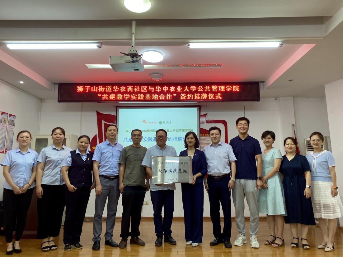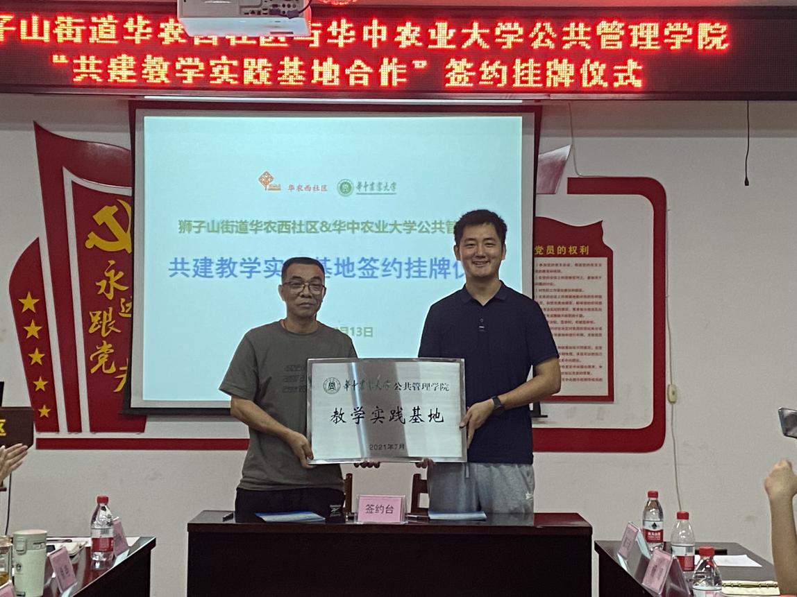 我院行政管理系主任姜庆志和华农西社区居委会主任肖万斌签订“共建教学实践基地”协议,并为西社区挂牌。