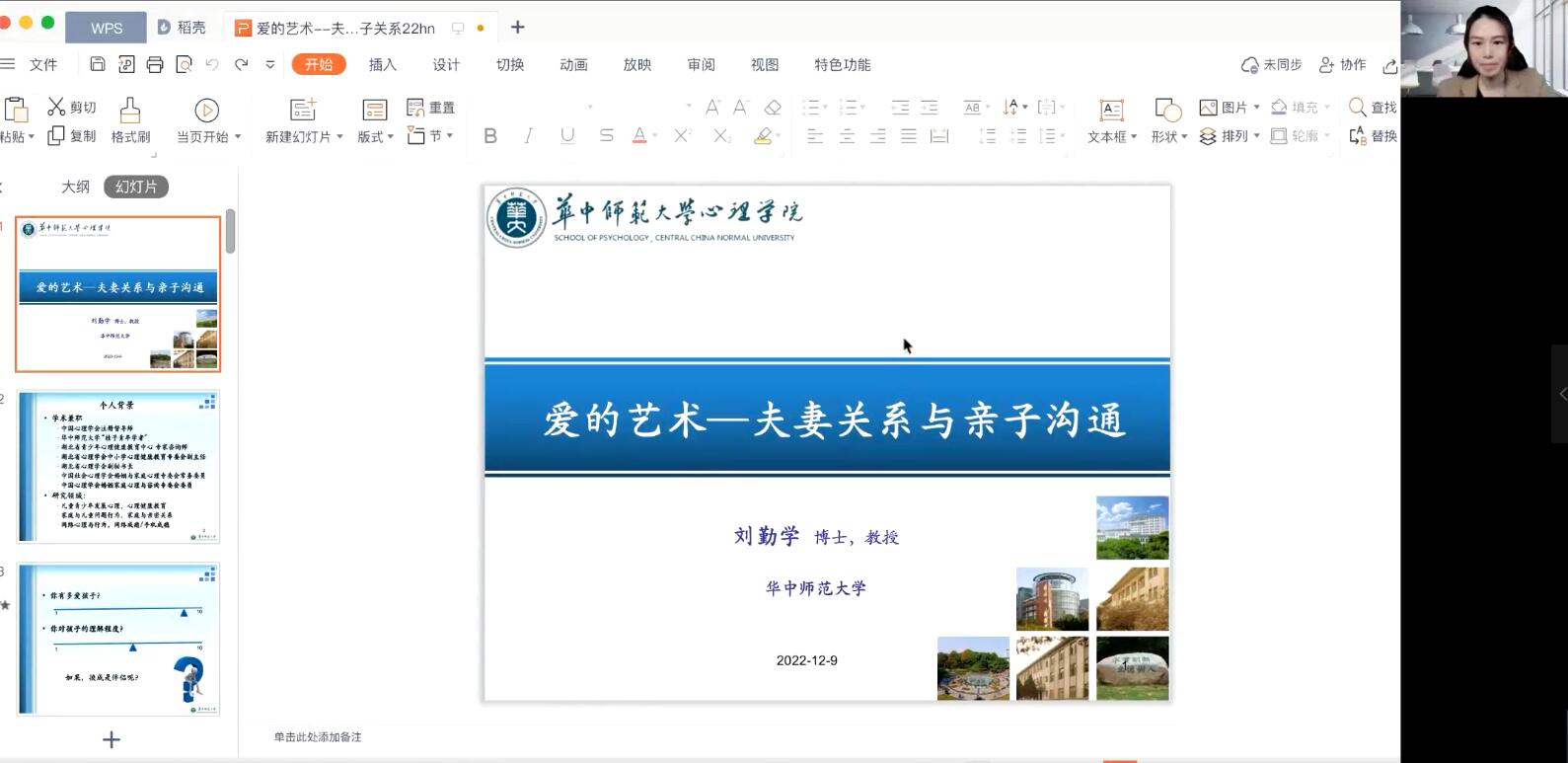 在腾讯会议组织了幸福公管建设能力提升讲座,华中师范大学教授刘勤学做了“爱的艺术—夫妻关系和亲子沟通”的主题讲座,H动漫