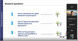 左成超副教授担任主持人。阿姆斯特丹自由大学Žiga Malek助理教授分享了中国 2035 年生物多样性和生态系统对话计划对土地利用的影响研究。格拉斯哥大学赵群山副教授应用非流体动力学模拟模型评估了树木影响下的现场热应力并获得最佳的树木布局。佛罗里达州立大学易洪涛教授通过回答“地方政府为什么要签订地方间环境协定?”和“地方管理者在地方间环境协议形成过程中扮演什么角色?”两个问题向大家介绍了变革推动者和地方间合作的相关内容。耶鲁大学博士后Yimeng Song以“Greenspace exposure and inequality in urban China”为题,解答了“如何描述绿地空间的空间分布特征?”“如何捕捉人与绿地之间的互动?”“不同城市的绿地覆盖率和不平等情况如何?”三个问题。此外,浙江财经大学专职研究员、林肯大学孙晔然副教授和约克大学Sohail Ahamd助理教授分别介绍了耕地系统变化对粮食生产和碳预算的影响、城市化背景下日间人口分布以及非洲和亚洲的城市土地利用效率,博士柳可和张悦也分别对城市扩张与耕地生态补偿效率的时空相关性和中国土地利用碳排放的空间关联网络及其驱动因素进行了研究。
