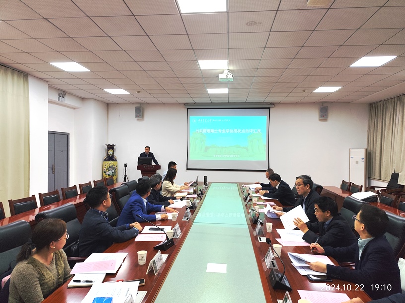副院长王家合教授向专家组做学位点情况自评汇报,从目标与标准、基本条件、人才培养、服务贡献等4个方面详细介绍了学校MPA的建设培养情况以及近5年来取得的进展和成效。