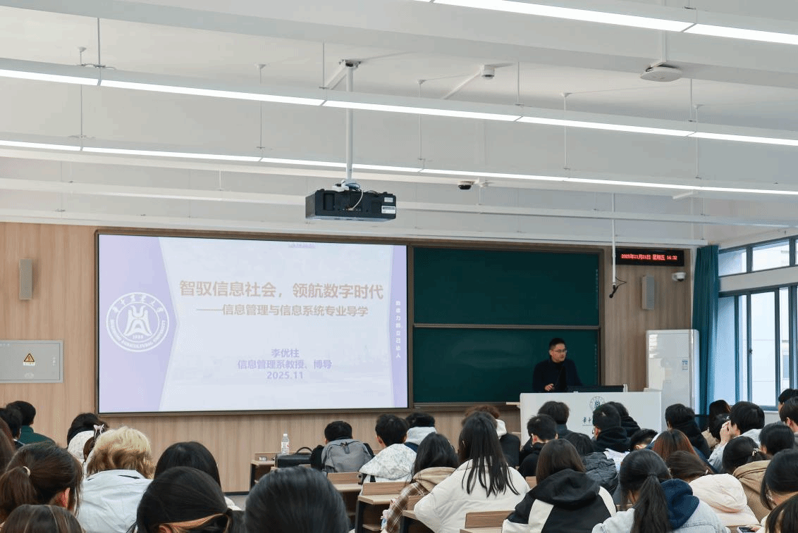 信息管理系教工党支部书记李优柱老师以"智驭信息社会,领航数字时代"为题,全面介绍了信息管理与信息系统专业特色、培养方案与就业前景。他指出,大数据与人工智能技术正深刻重塑管理科学研究范式与产业实践。李老师还展示了近年来学生在数学建模、程序设计、外语竞赛等国家级赛事中的优异表现,指出毕业生就业面广、发展潜力大,鼓励同学们夯实专业基础,激发学科热情,勇担时代使命。