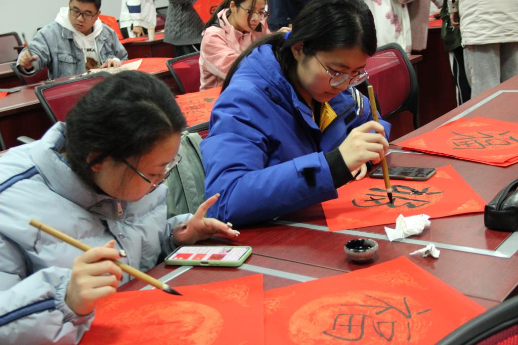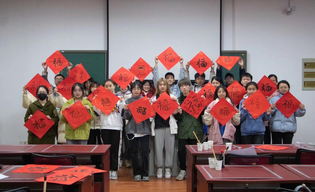 活动现场,墨香四溢,暖意融融,参与师生们手握毛笔,摆开架势,一会儿书写隶、行、篆等各种“福”字,一会儿又采用书画结合的方式创意各种图文结合的“福”字。一副副端秀清新、活泼灵动的“福”字传递出浓郁的新春祝福。送“福”的喜悦,营造出浓郁的春节文化氛围,承载了师生对美好生活的希望。