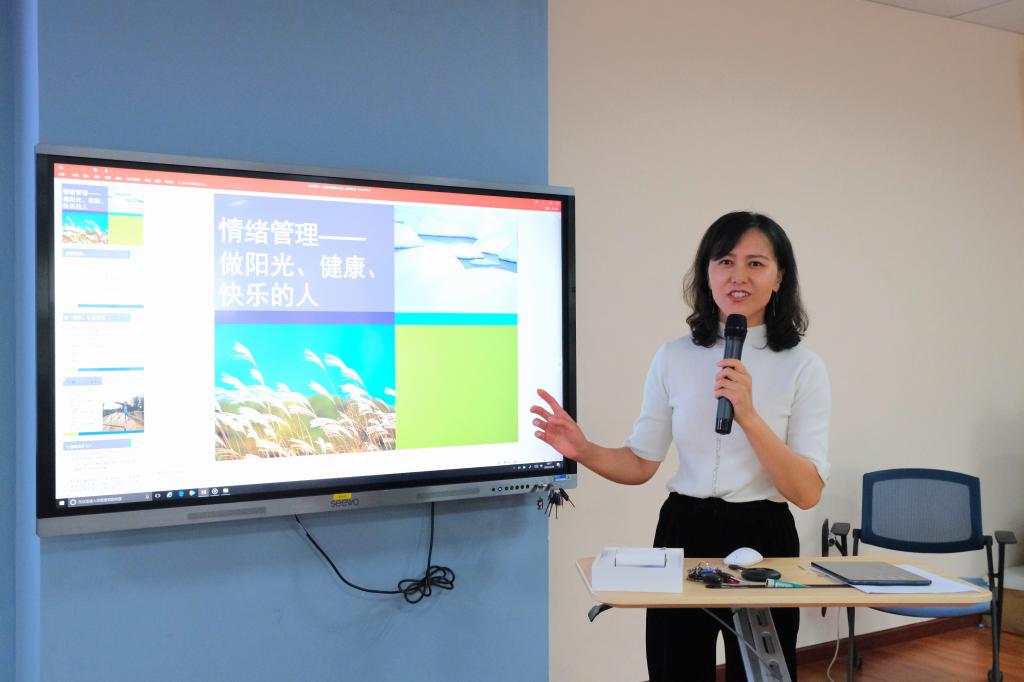 “你们在工作中有因为打印机卡纸而让自己破防吗?”“遇到压力时你们如何化解?“多重身份的你们在日常生活中如何控制自己的情绪?”丁艳华首先抛出几个小问题,大家现场开始了讨论。接着她和大家一起学习了什么是情绪、情绪管理、阳光心态自我提升的途径。她总结道:“我们在生活之中要做到一个能上能下的贤者,上能提高玻璃杯的高度与刚度,增强个人耐受力,下能降低石子的深度与广度,提高负面情绪的泄洪能力。”
