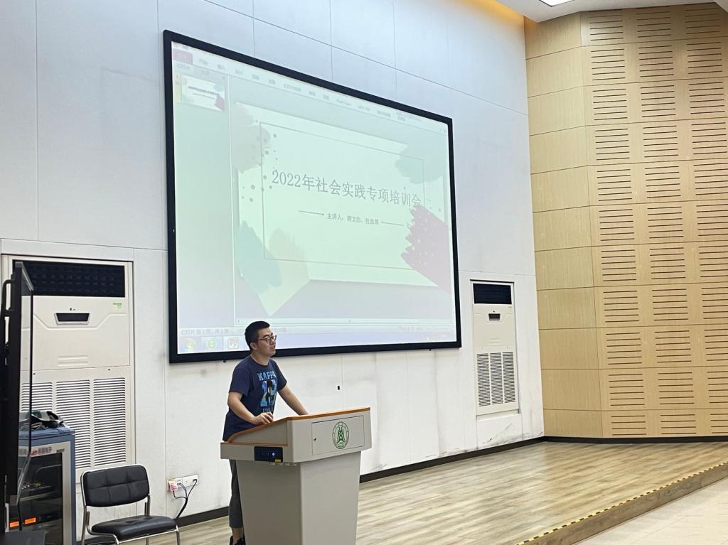 于三教S1报告厅召开2020级暑期社会实践动员大会暨专项培训会,2018级社会实践先进个人获得者胡文伯 、2019级社会实践先进个人获得者杜启昂、2020级全体同学以及辅导员徐冠博出席会议。