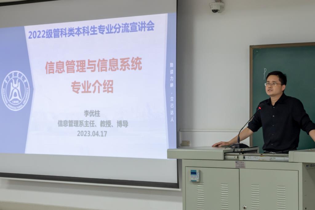 于三教B205召开2022级专业分流宣讲会,由工程管理系王歌、信息管理系李优柱、行政管理系姜庆志、土地资源管理系曾晨主讲,全体2022级学生参与。