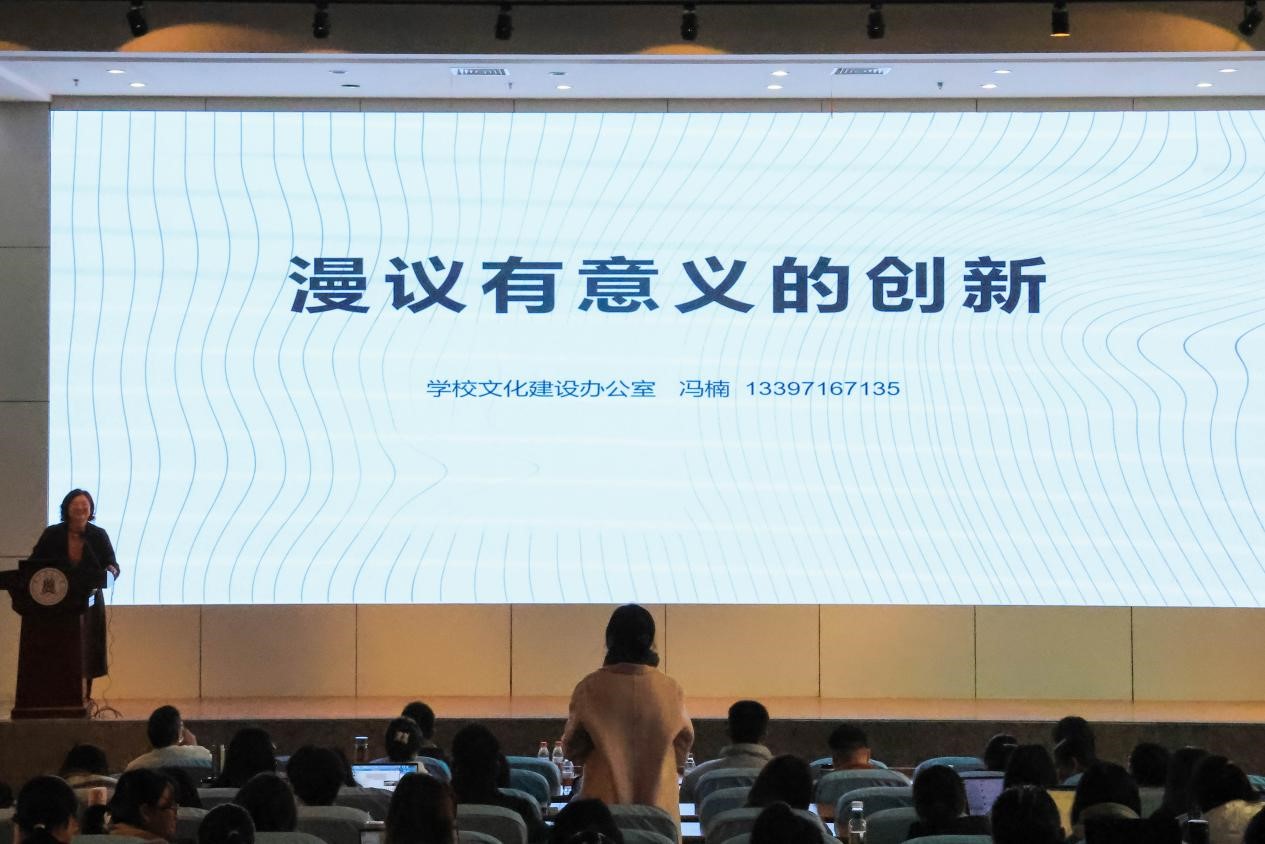 紧接着,校文化办主任冯楠老师以“推翻已知围栏、跳出固有模式、发现一点闪光”为题,鼓励大学生积极创新、大胆实践。冯老师提出大学生要保持求知好奇,守护坚定信念,积极营造创新的氛围条件,从而推动有意义的创新的实现;同时,冯老师向骨干们阐释了“狮山美学”的文化育人路径,倡导学校在以文化人、以美育人的实践中,面向全体学生的全面发展,鼓励有意义的创新,展现精神健硕的大学之美;最后,冯老师希望学生骨干可以积极参与到校园文化的建设中,共同建设狮山家园。