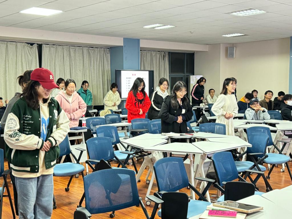 培训过程中,田惠还邀请了一男一女两位同学来模拟进行见面的交流礼仪。两位同学面对面握手并互相问候,田老师还亲自与同学进行表演交流,现场气氛热烈有趣,同学们掌声不断。