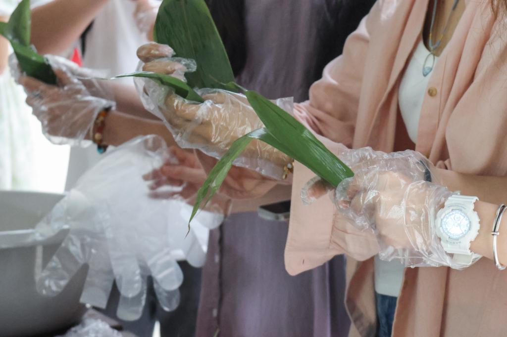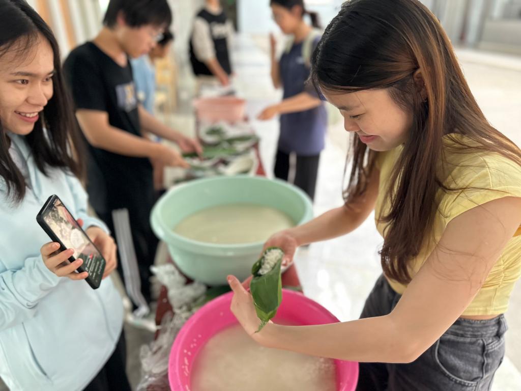 活动伊始,工作人员向参与师生介绍了端午节的由来、习俗和所蕴含的文化内涵等,在场师生在学习之后进行了“端午知识趣味云答题”,便迫不及待投入到体验民俗活动——包粽子当中去了。大家纷纷动手尝试,从泡糯米、清洗粽叶,到包裹、捆扎,每一个步骤都格外认真。大家互相帮助,分享技巧,欢声笑语中,一个个形态各异的粽子在师生们的手中诞生,粽叶的清香弥漫在整个活动现场。