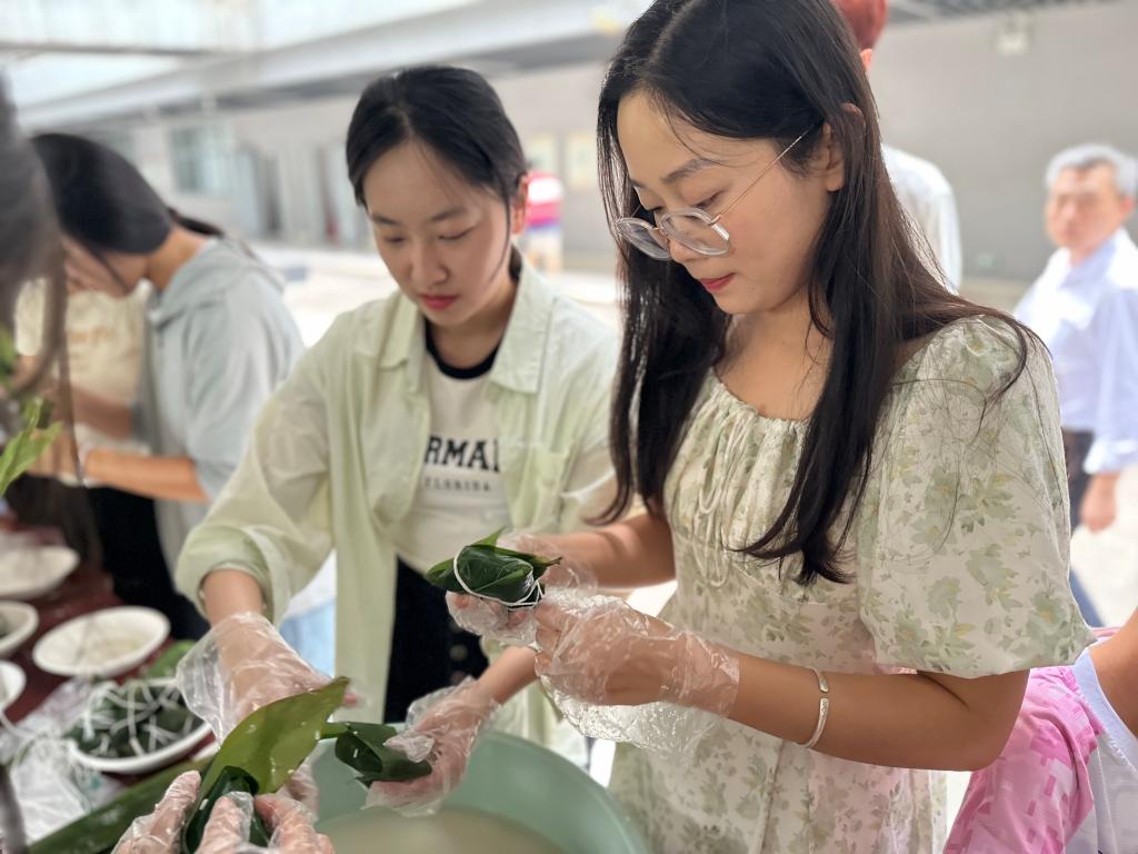 6月7日,在人文社科楼中厅,翠绿的粽叶与柔软的细绳交织成一幅生动的画面。师生们欢聚一堂,一片片粽叶在他们手中灵巧地翻转、折叠,随后被紧紧地扎好,形成一个个饱满的粽子。现场气氛热烈而有序,伴随着粽叶的清香和欢笑声,一场别开生面的“粽叶飘香,端午安康”活动正在这里温馨上演。