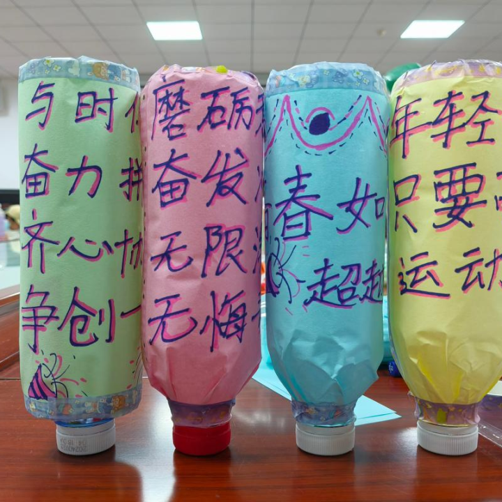 同学们脑洞大开,利用矿泉水瓶、彩纸、贴画和胶带,打造出独具创意、鼓舞人心的“加油瓶”。这些瓶子将在10月18日至19日的运动会上,为运动员们送上加油助威的力量。五彩斑斓的卡纸上,呈现出独一无二的图案,搭配上激励人心的口号和标语。瓶子里还藏着五彩缤纷的塑料石子,摇晃瓶身,就能听到宛如加油喝彩的清脆声响。装饰完成后,大家小心翼翼地用胶带固定,整齐地摆放好,期待在运动场上为运动员们加油助威!