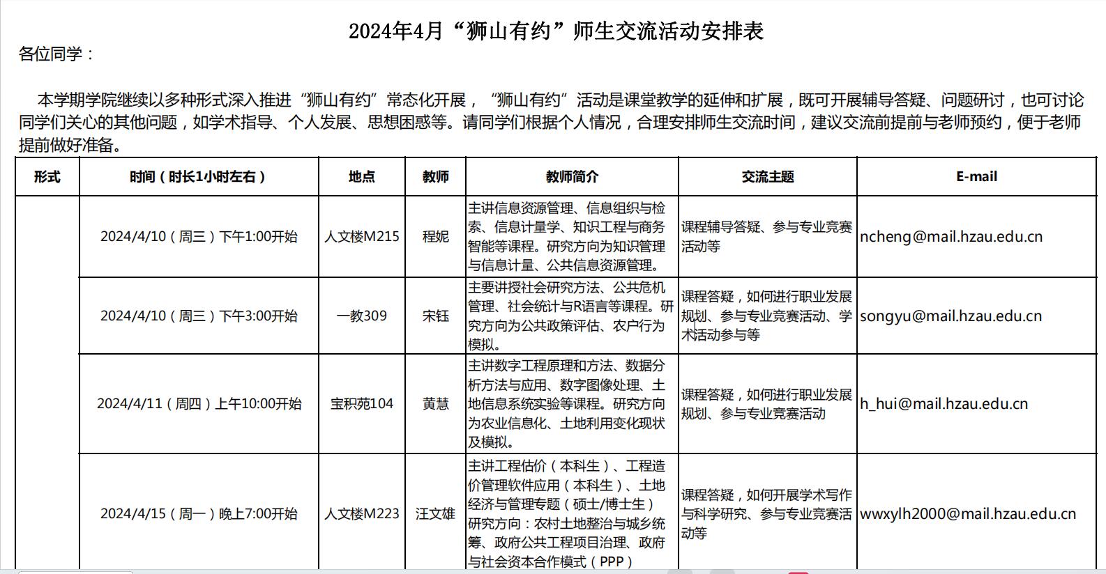 各位同学: 本学期H动漫 继续以多种形式深入推进“狮山有约”常态化开展,“狮山有约”活动是课堂教学的延伸和扩展,既可开展辅导答疑、问题研讨,也可讨论同学们关心的其他问题,如学术指导、个人发展、思想困惑等。请同学们根据个人情况,合理安排师生交流时间,建议交流前提前与老师预约,便于老师提前做好准备。